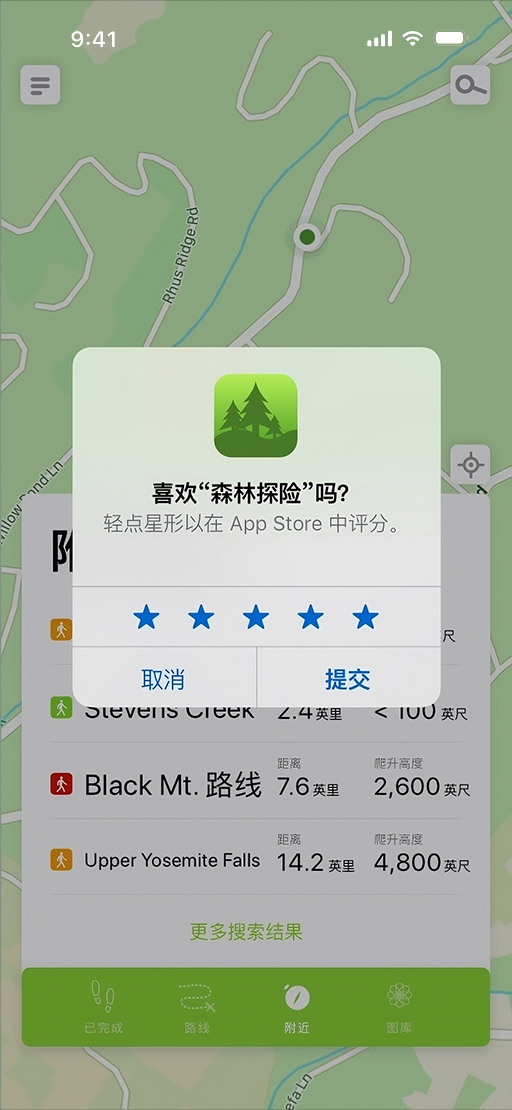 借助 SKStoreReviewController API,你能为用户提供一种更简单的方法来为你的 App 提供反馈。在 365 天以内,你最多可向用户征求三次评分。用户会经由你的预设提示来提交评分,撰写和提交评论时他们也不必离开该 App。