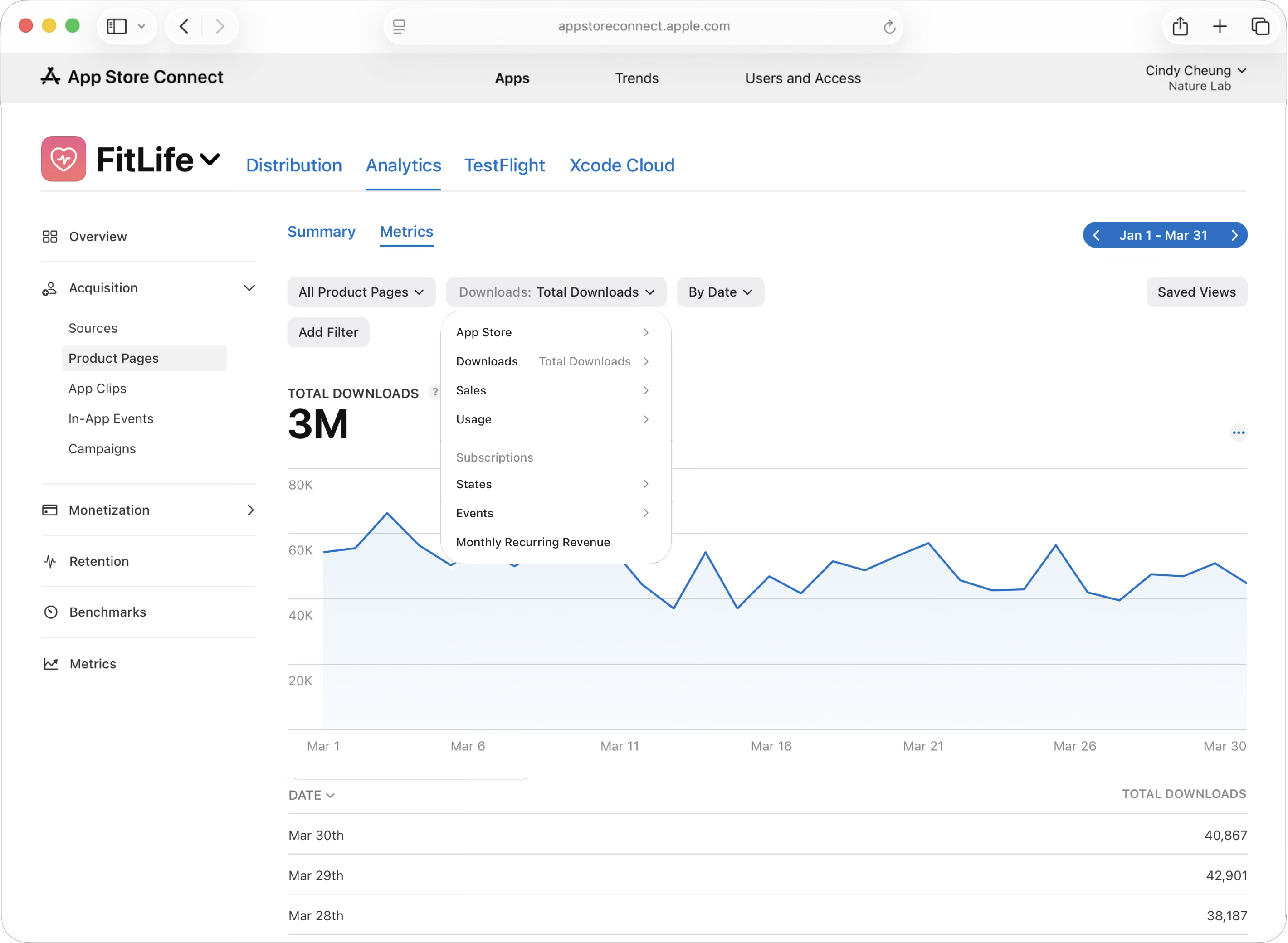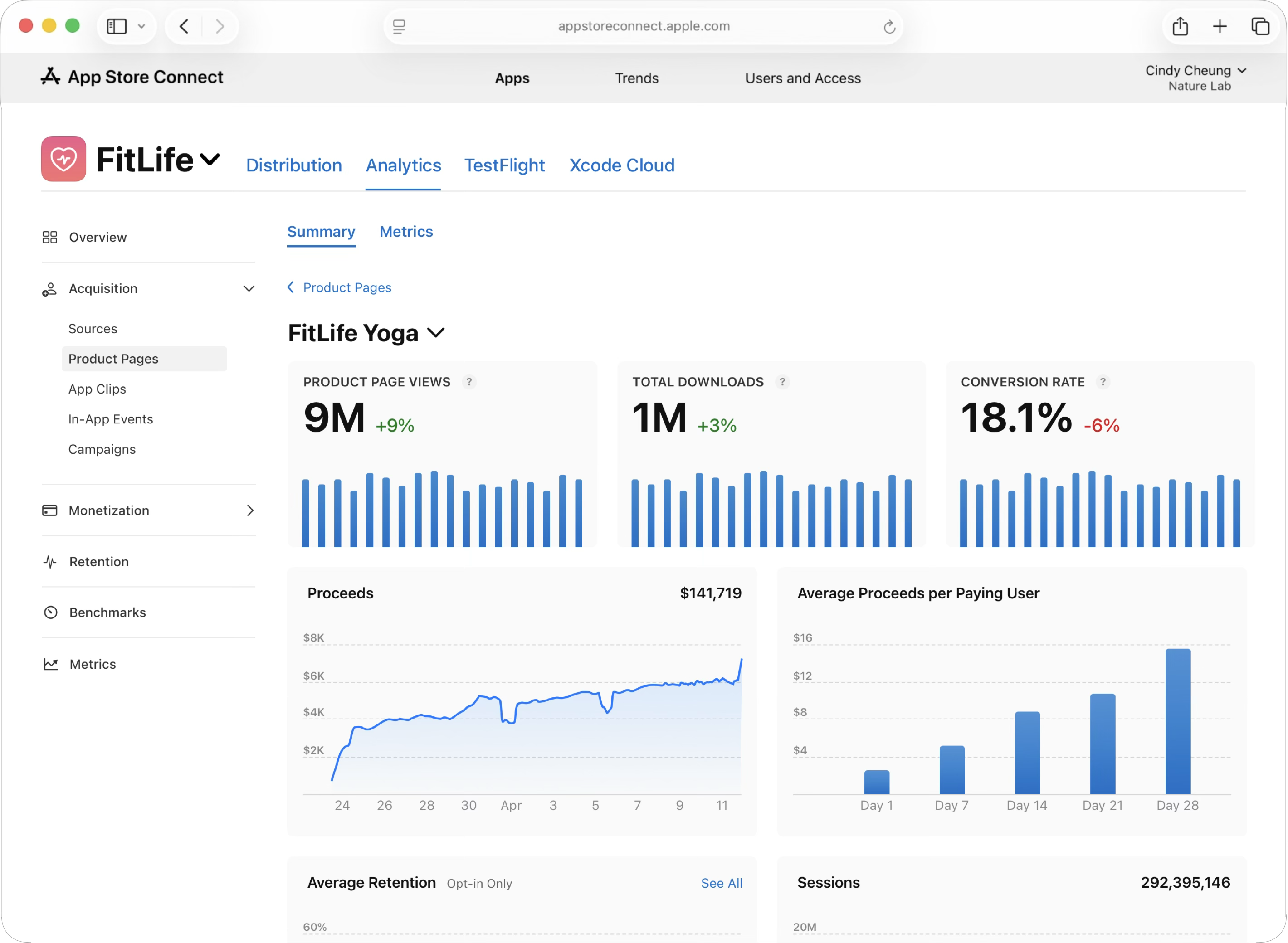 在 App Store Connect 中的“分析”板块,你能够查看产品页面查看次数、下载次数和转化率,以及订阅表现和销售额等后续指标,据此衡量每个页面在顾客旅程中的表现。你不仅能评估各个页面的转化率,还能了解哪个页面带来的用户价值最高。
