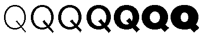 Applications use AAT style variations by passing the font a list of style coordinates that describe the degree of stylizing for each of the font's possible style variations. A style coordinate is a pair of numbers. The tag identifies the style axis and the coordinate specifies how much of that variation to apply. Typical axes are color, width, contrast, and optical size. The following figure shows a style axis for bold. The minimum boldness is on the left and the maximum boldness is on the right. The center glyph is the default level of boldness for this font.