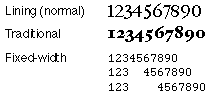 A noncontextual formis an alternate form of a glyph that can be used anywhere in text, regardless of its context. An example of this might be two or more styles of the number set 0 through 9. You might include one set of numbers which proportional spacing and one set with fixed-width spacing for users who want to create columns of numbers with your font. In the following figure, there are three forms of the number set (although not all from the same font): lining numbers, which are numbers with proportional spacing that are about the same height and do not extend below the baseline; traditional numbers, which are numbers with proportional spacing that vary in height and position in relation to the baseline; and fixed-width numbers, which are appropriate for tabulations.