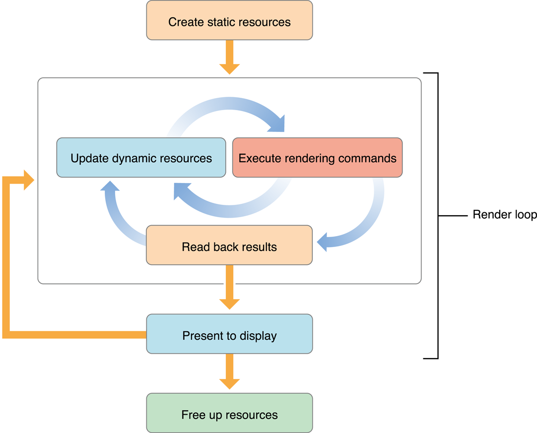 An important goal for this inner loop is to avoid copying data back from OpenGL ES to the app. Copying results from the GPU to the CPU can be very slow. If the copied data is also used later as part of the process of rendering the current frame, as shown in the middle rendering loop, your app blocks until all previously submitted drawing commands are completed.