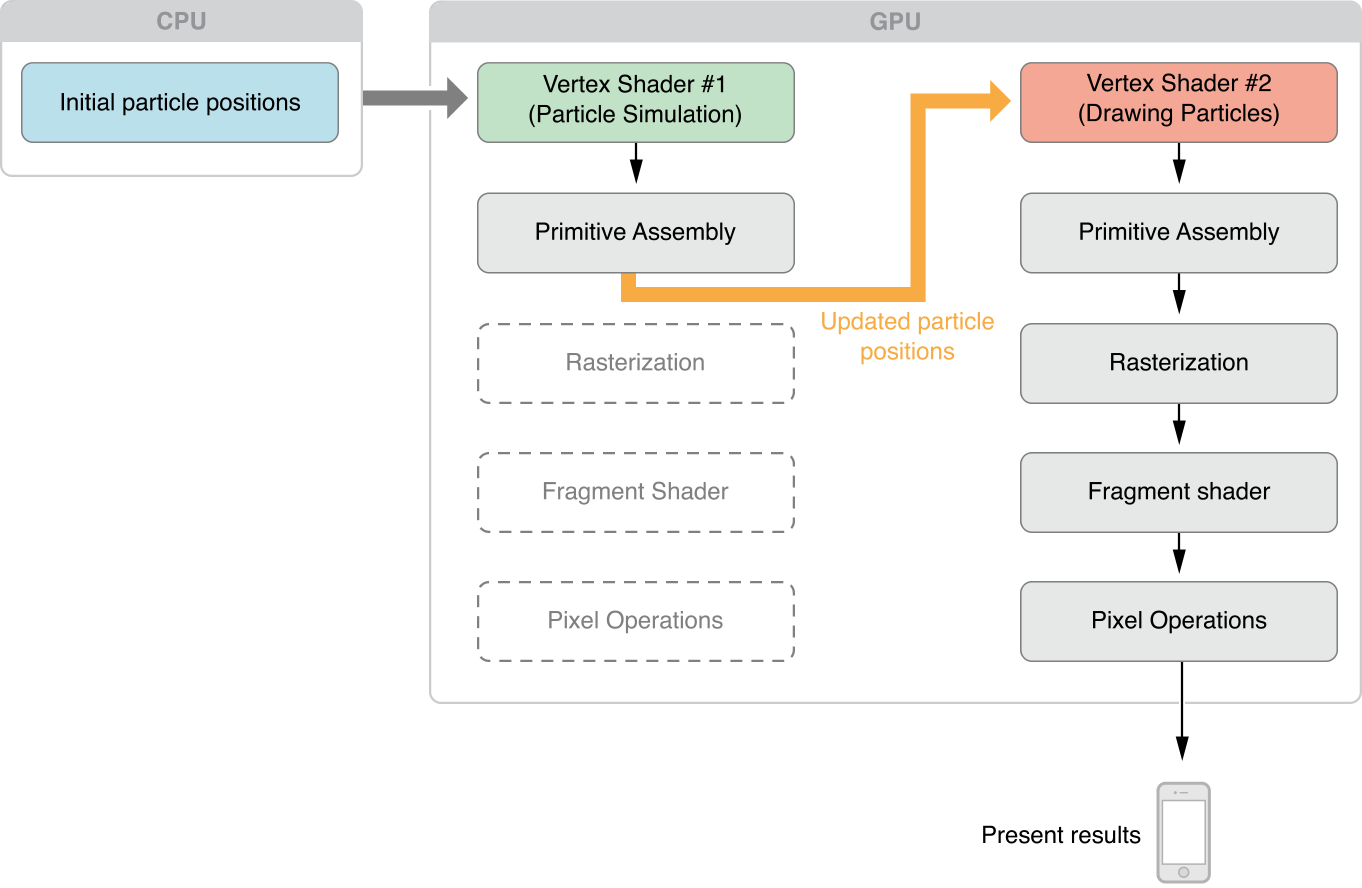 Traditionally, apps implementing particle systems run their simulations on the CPU, storing the results of the simulation in a vertex buffer to be used in rendering particle art. However, transferring the contents of the vertex buffer to GPU memory is time-consuming. Transform feedback, by optimizing the power of parallel architecture available in modern GPU hardware, solves the problem more efficiently.
