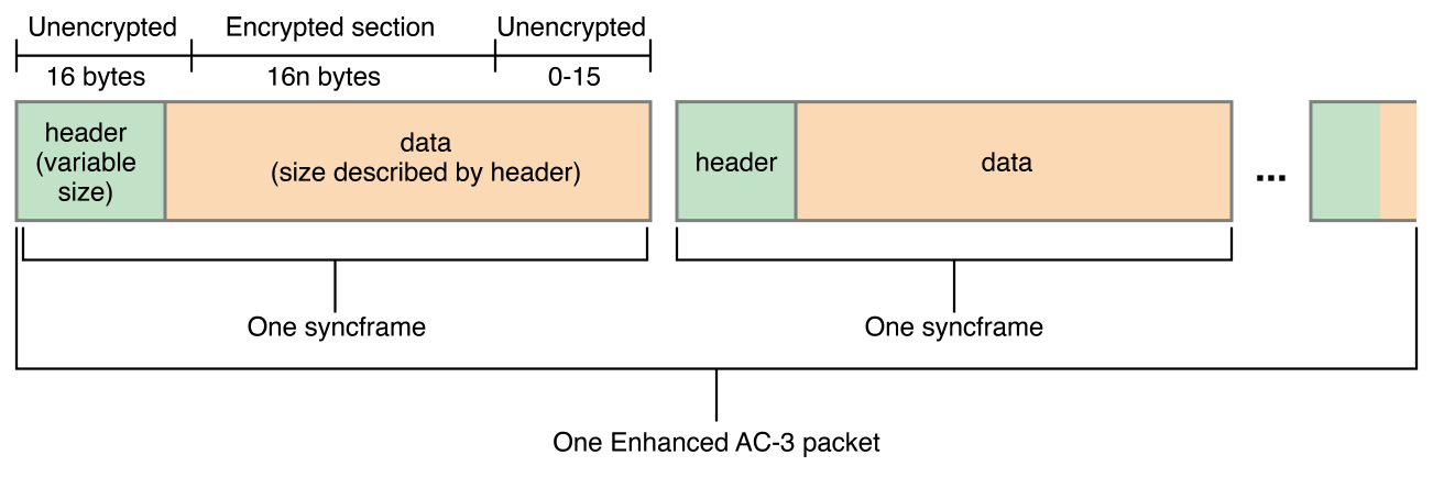 The first 16 bytes, starting with the syncframe() header, are not encrypted. The contiguous data section that follows is encrypted. The AC-3 frame ends with 0 to 15 unencrypted bytes. Start code emulation prevention is not performed on the encrypted part of the frame.