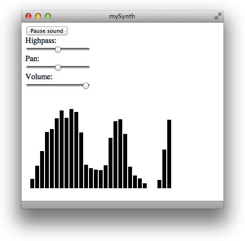 Listing 3-1 selects a sound at random, passes the sound through audio filters, and loops the sound while the audio spectrum is drawn on an HTML5 canvas, as shown in Figure 3-1. It also provides controls for adjusting filter properties and pausing a playing sound.