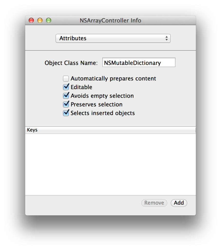 Each view and controller class exposes a set of bindings. You can inspect the bindings of an object using Interface Builder by selecting it and displaying the Bindings pane in the Info window. Select your array controller in the nib file and display its bindings as shown in Figure 4.