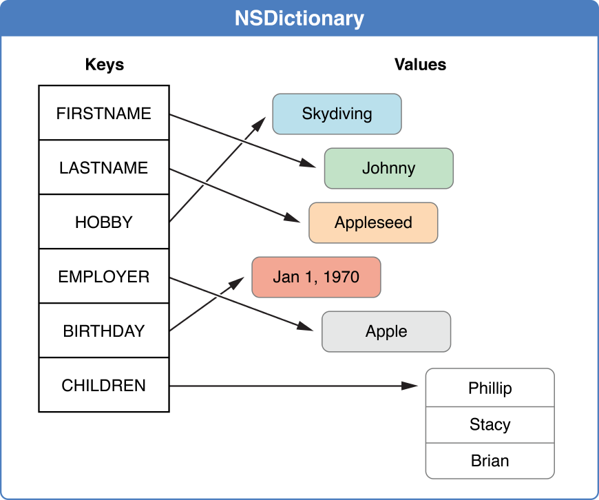 Dictionaries manage pairs of keys and values. A key-value pair within a dictionary is called an entry. Each entry consists of one object that represents the key, and a second object which is that key’s value. Within a dictionary, the keys are unique—that is, no two keys in a single dictionary are equal (as determined by isEqual:). A key can be any object that adopts the NSCopying protocol and implements the hash and isEqual: methods. Figure 1 shows a dictionary which contains information about a hypothetical person. As shown, a value contained in the dictionary can be any object, even another collection.