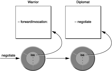 Although forwarding mimics inheritance, the NSObject class never confuses the two. Methods like respondsToSelector: and isKindOfClass: look only at the inheritance hierarchy, never at the forwarding chain. If, for example, a Warrior object is asked whether it responds to a negotiate message,