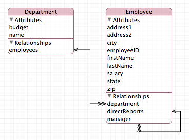 A line with one or two open arrow heads represents a relationship. A single arrowhead denotes a to-one relationship; a double arrowhead denotes a to-many relationship. The direction of an arrow indicates the direction of the relationship—the arrow points to the destination entity. Figure 1 shows an example of the diagram view of a simple data model, with all compartments expanded.