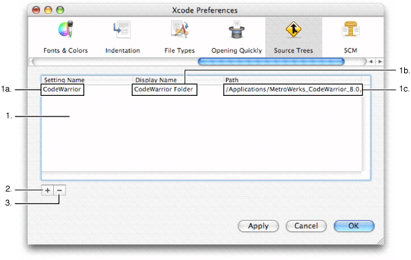The Source Trees pane of the Xcode Preferences window lets you define source trees for all projects that you open. A source tree defines a common access path or output location for the files used or generated by your project. Figure 39-12 shows the Source Trees pane of Xcode Preferences.
