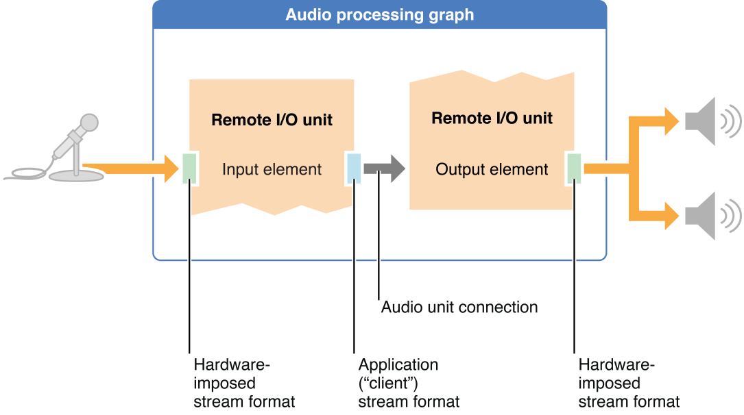 As you can see in the figure, the audio input hardware imposes its stream format on the outward-facing side of the Remote I/O unit’s input element. You, in turn, specify the format that you want to use on the inward-facing side of this element. The audio unit performs format conversion as needed. To avoid unnecessary sample rate conversion, be sure to use the audio hardware sample rate when defining your stream format.