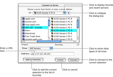 To connect to the selected server or to connect to the URL specified in the Address text field, the user clicks the Connect button, which causes the dialog box to be dismissed and the selected URL to be returned to the calling application.