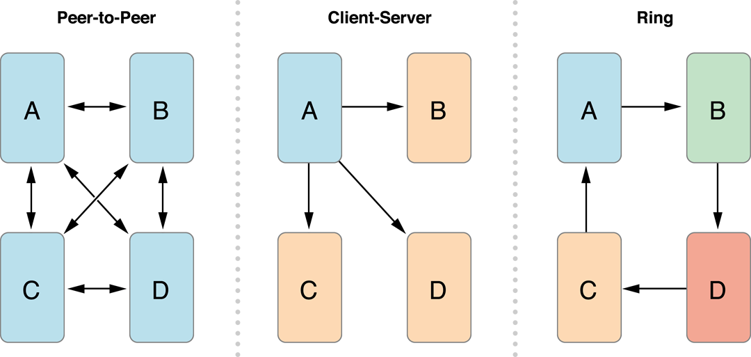 GKMatchobject creates a full peer-to-peer connection between all the participants, you can reduce the network traffic by layering a ring or client-server networking architecture on top of it. Figure 7-1 shows three possible network topologies for a four-player game. On the left, a peer-to-peer game has 12 connections between the various devices. However, you could layer a client-server architecture on top of this by nominating one of the devices to act as the host. If your game transmits to or from the host only, you can halve the number of connections. A ring architecture allows devices to forward network packets to the next device only, but further reduces the number of connections. Each topology provides different performance characteristics, so you will want to test different models to find one that provides the performance your game requires.Figure 7-1 Network topologies