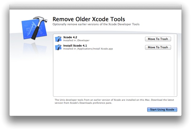 The simplification afforded by repackaging Xcode 4.3 as a single app bundle eliminates the need for the /Developer directory containing prior versions of Xcode. As a result, the Install Xcode application and the uninstall-devtools command line script are also no longer needed.