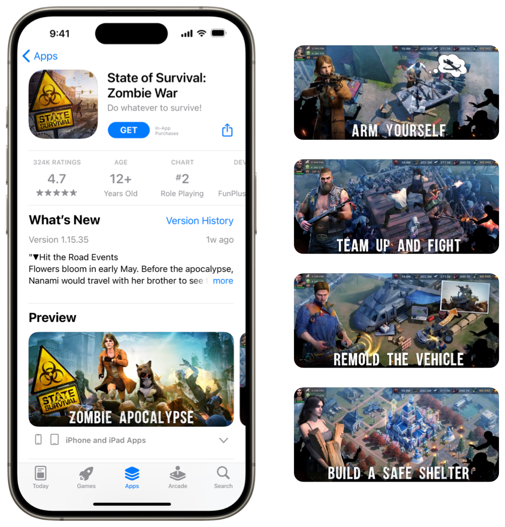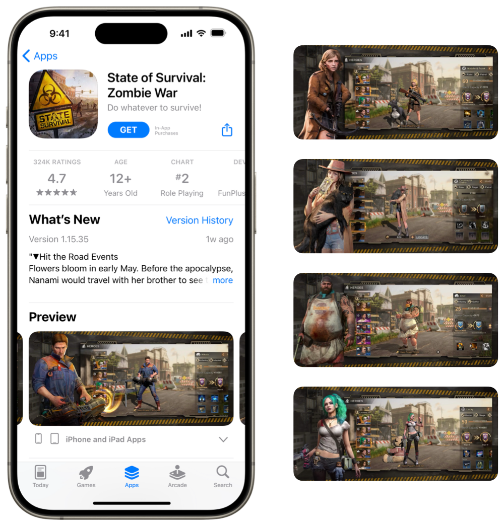 ベストプラクティス:カスタムプロダクトページのスクリーンショットで、RPGならではの機能を紹介します。オンラインマーケティングと同じクリエイティブを使用し、ユーザージャーニーの一貫性を確保します。