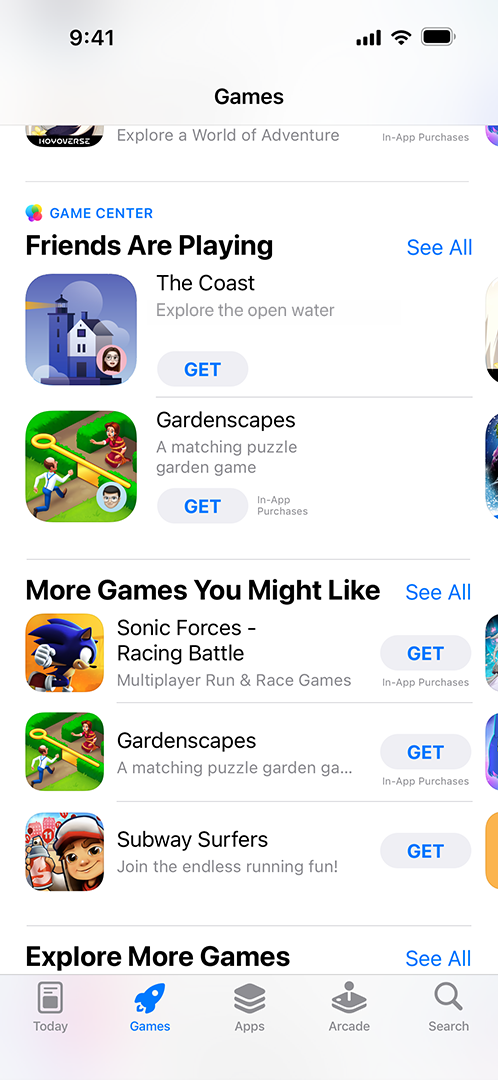 App Store. 플레이어는 App Store에서 Game Center 및 ‘친구들이 플레이 중인 게임’ 섹션을 통해 친구들이 하고 있는 새로운 게임을 발견할 수 있습니다.