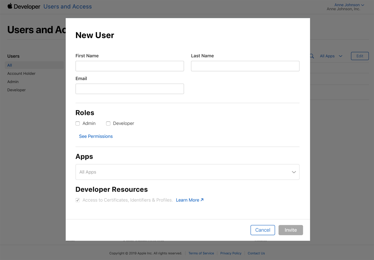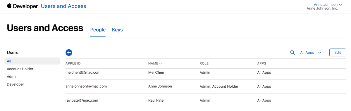 조직에서는 개발 팀에 사람을 추가할 수도 있습니다. Apple Developer Program에 등록한 경우 App Store Connect에서 팀 멤버를 관리할 수 있습니다. 자세한 내용은 App Store Connect 도움말의 ‘사용자 추가 및 편집’을 참고하시기 바랍니다.