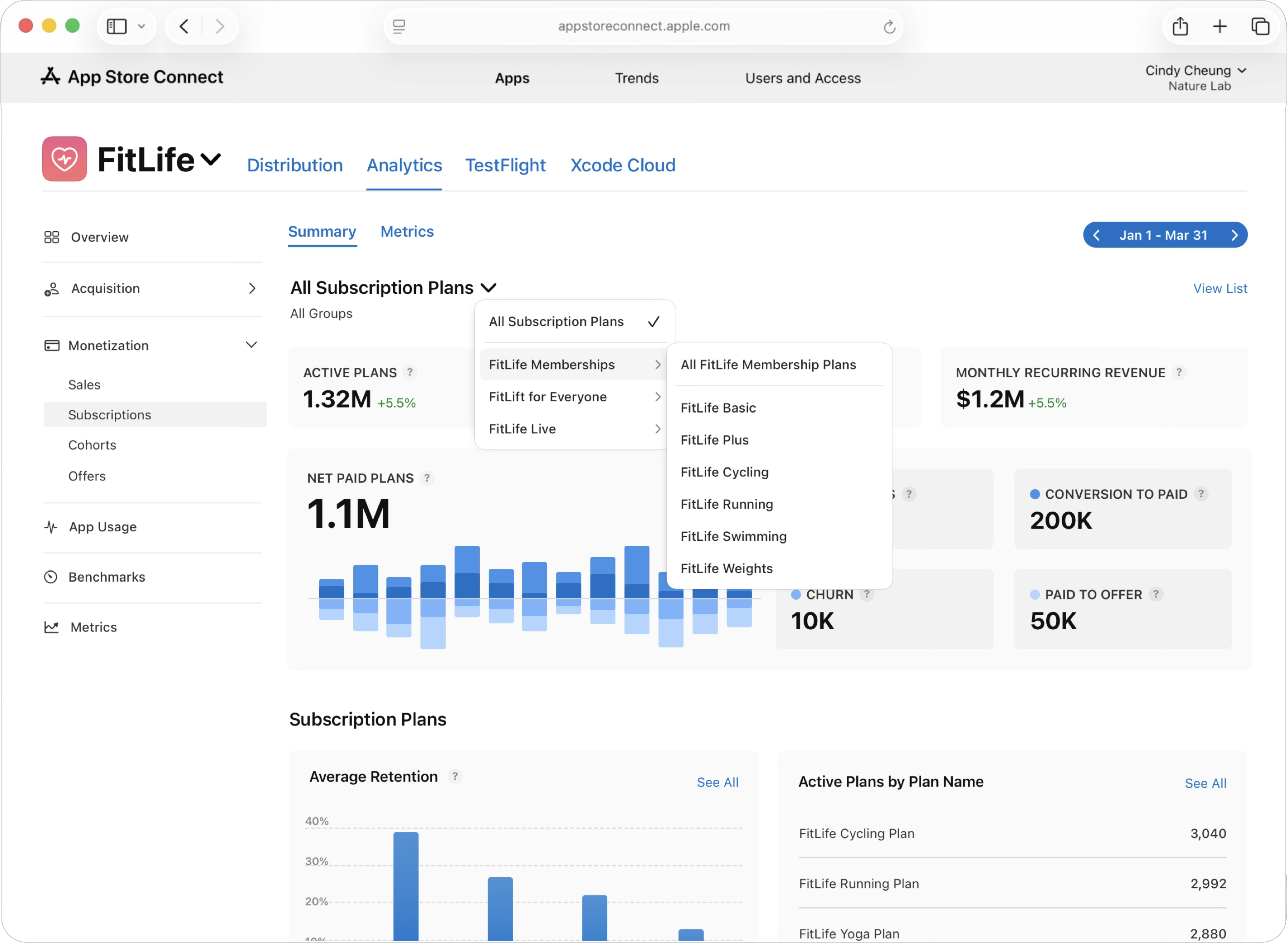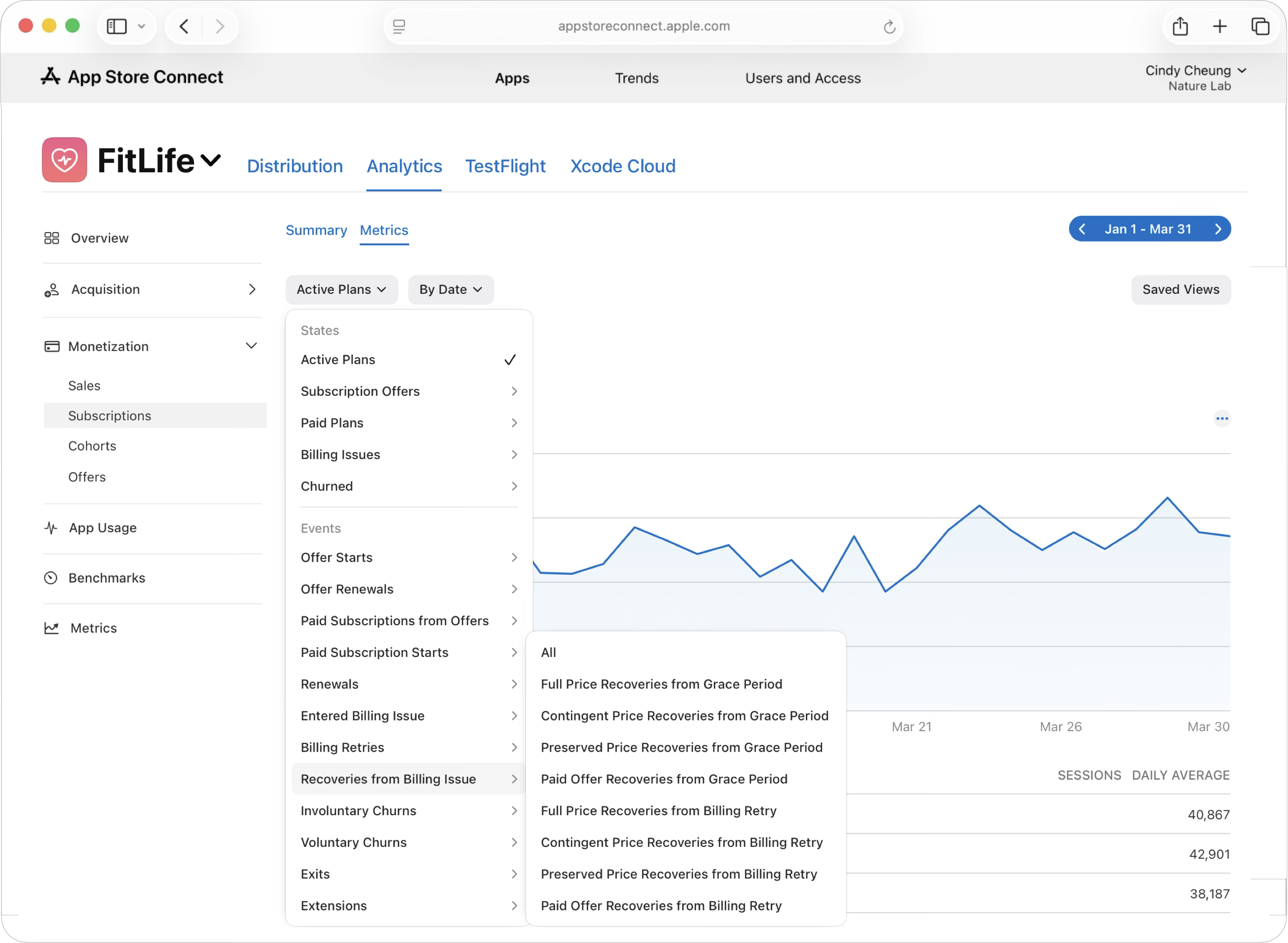 App Store Connect의 “분석”은 무료 체험 시작부터 전환, 갱신, 복구, 이탈에 이르기까지 전체 구독 주기를 이해할 수 있도록 지원합니다. 또한 활성 상태의 요금제, 무료 체험, 유료 프로모션, 전환, 갱신, 비자발적 이탈, 자발적 이탈, 복구 지표를 전체 가격 상태(정상 가격, 유지된 가격, 조건부 가격 등)에 걸쳐 측정할 수 있습니다. 이러한 지표를 통해 유입 경로, 유지율, 수익화를 한 곳에서 평가할 수 있습니다.