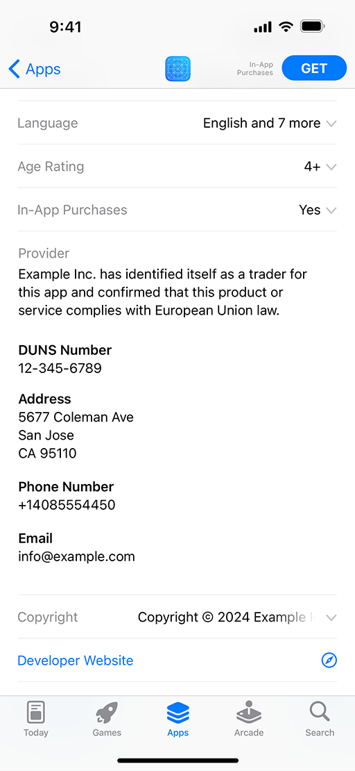 디지털 서비스법(DSA) 제30조 및 제31조에 따라 Apple은 유럽 연합의 App Store에서 앱을 배포하는 모든 거래자의 연락처 정보를 확인하고 표시해야 합니다. 여기에는 DSA에 따라 App Store 제품 페이지에 게시할 목적으로 귀하가 Apple에 제공하는 주소, 전화번호 및 이메일 주소가 포함됩니다. 인증이 완료되면 앱이 유럽 연합의 27개 지역에 배포될 때 Apple은 이 정보를 App Store 제품 페이지에 게시합니다. 유럽 연합에서 앱을 배포하지 않더라도 거래자 상태를 신고해야 합니다.