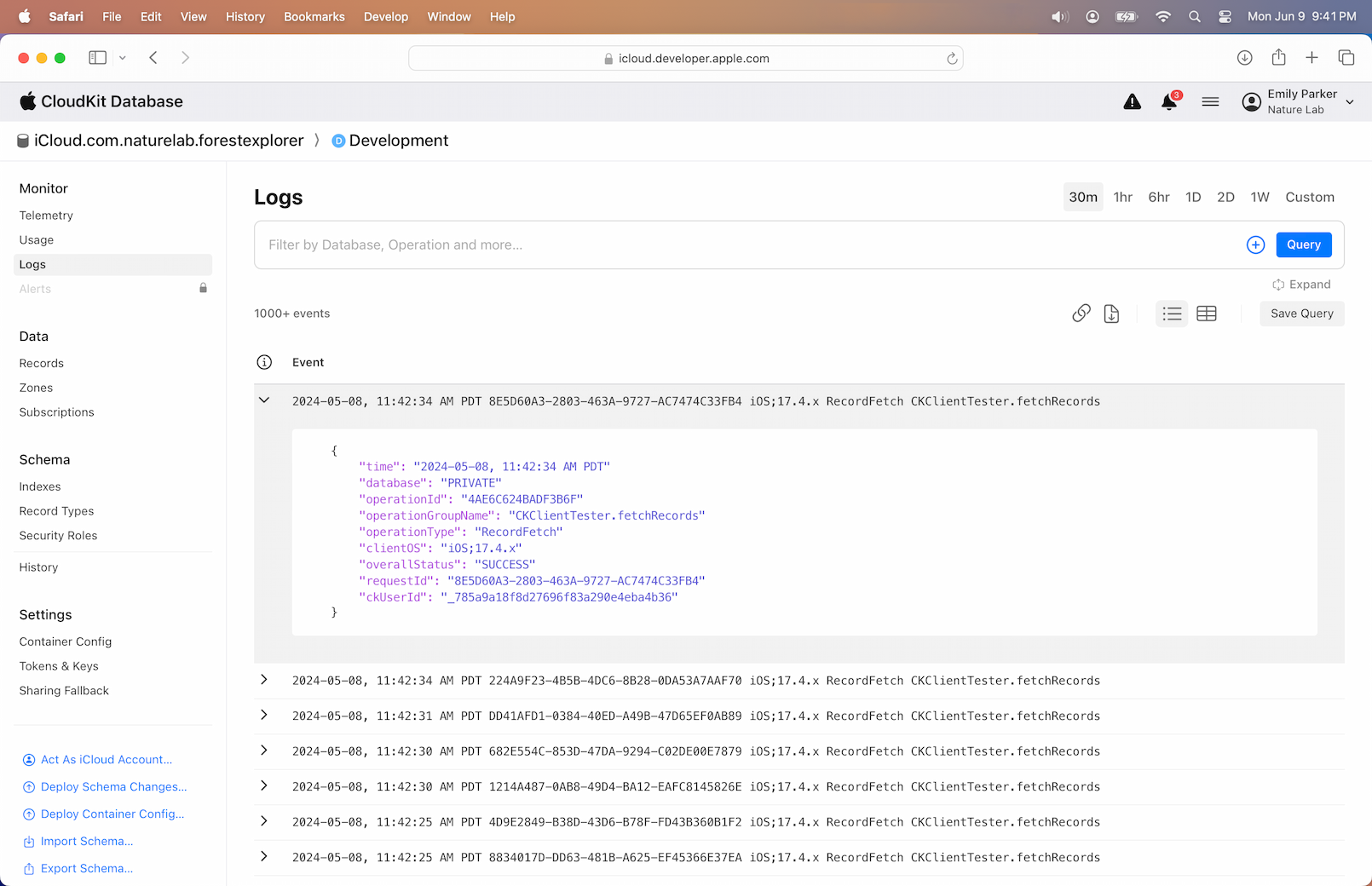 사용자 데이터를 비공개로 유지하면서 문제를 분석하고 디버그할 수 있습니다. 로그는 개인 식별 정보를 노출하지 않으면서 각 사용자에 대한 모든 CloudKit 서버 이벤트를 표시합니다. 로그 항목은 컨테이너별로 익명의 CloudKit 사용자 ID만 표시하여 실제 ID를 노출하지 않습니다. 계정별로 기록이 수정되었다는 사실은 보고서에서 확인할 수 있지만 변경된 실제 데이터는 표시되지 않습니다.