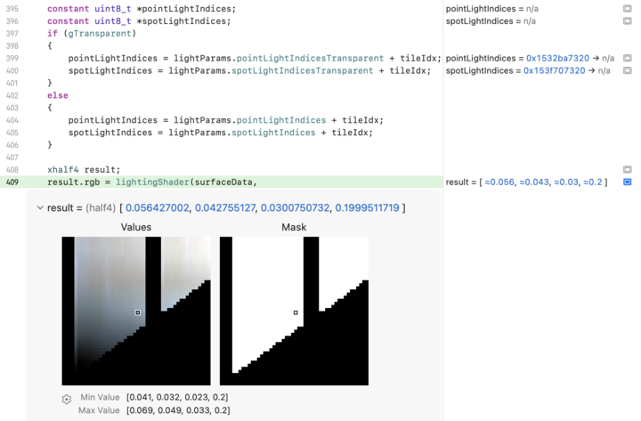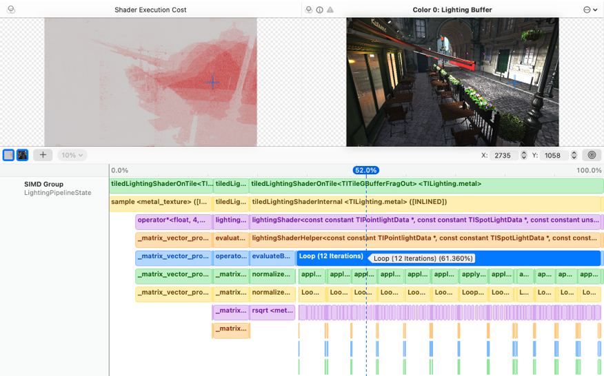 종합 Metal 개발자 도구 제품군은 Metal 셰이더 컨버터와 완벽하게 호환됩니다. 컴파일할 때 프로젝트가 디버그 정보를 포함하도록 준비하고 나면 Metal로부터 실행 시간 검증 오류를 받아 볼 수 있습니다. Metal 디버거는 변환된 셰이더의 디버깅 및 프로파일링도 지원합니다.