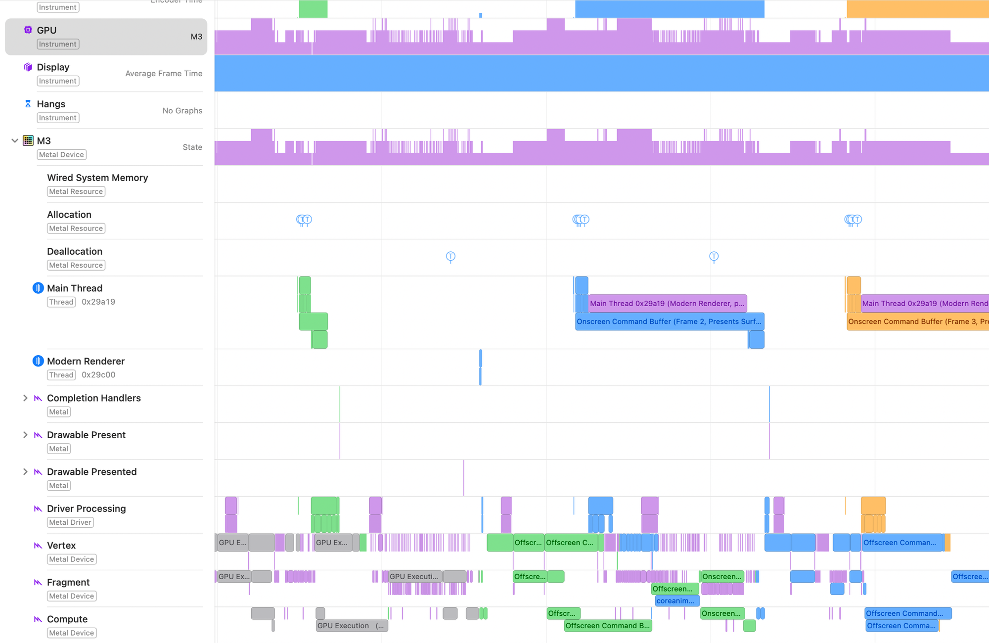 Instruments의 Metal System Trace 템플릿은 CPU, GPU 및 Metal 앱의 메모리 사용량에 대한 병렬 작업을 시각적 타임라인으로 보여 줍니다.