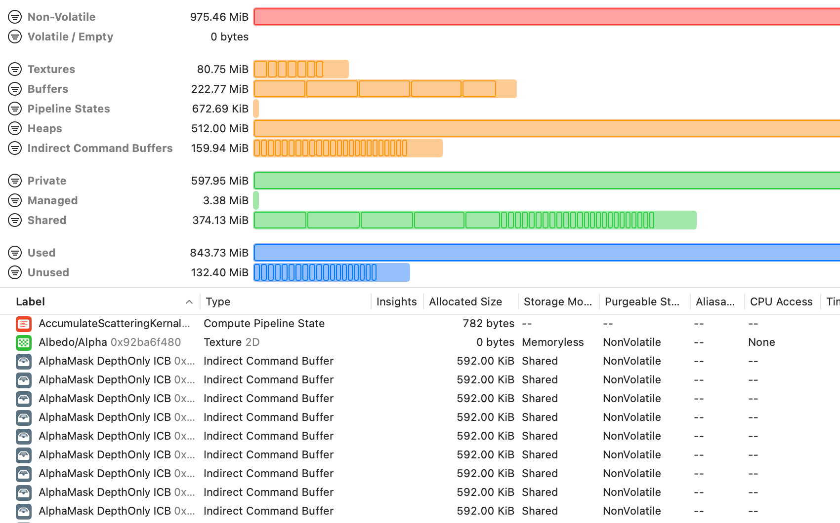 Metal 디버거에는 Metal 메모리 사용량에 대한 종합적인 보고서가 포함되어 있어 Metal 앱의 메모리 사용량을 최적화하고 줄일 수 있습니다.