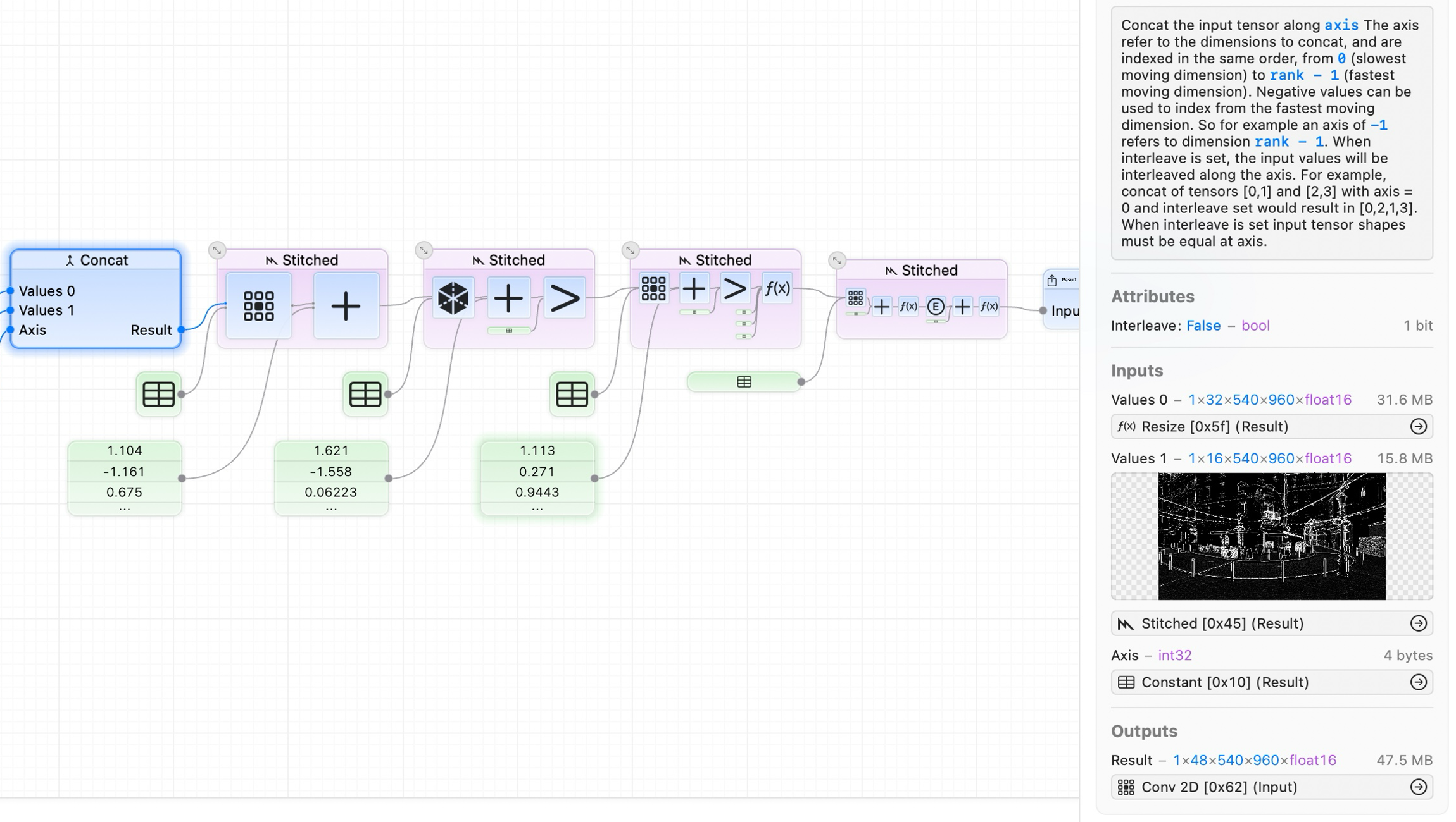 연산이 실행을 위해 어떻게 최적화되는지 시각화하고, 어떤 연산이 GPU에서 함께 스티칭되거나 Neural Engine에 오프로드되는지 확인할 수 있습니다. 스티칭된 연산은 최적화된 단일 Metal 셰이더로 융합되므로 중간 메모리 오버헤드가 발생하지 않습니다.