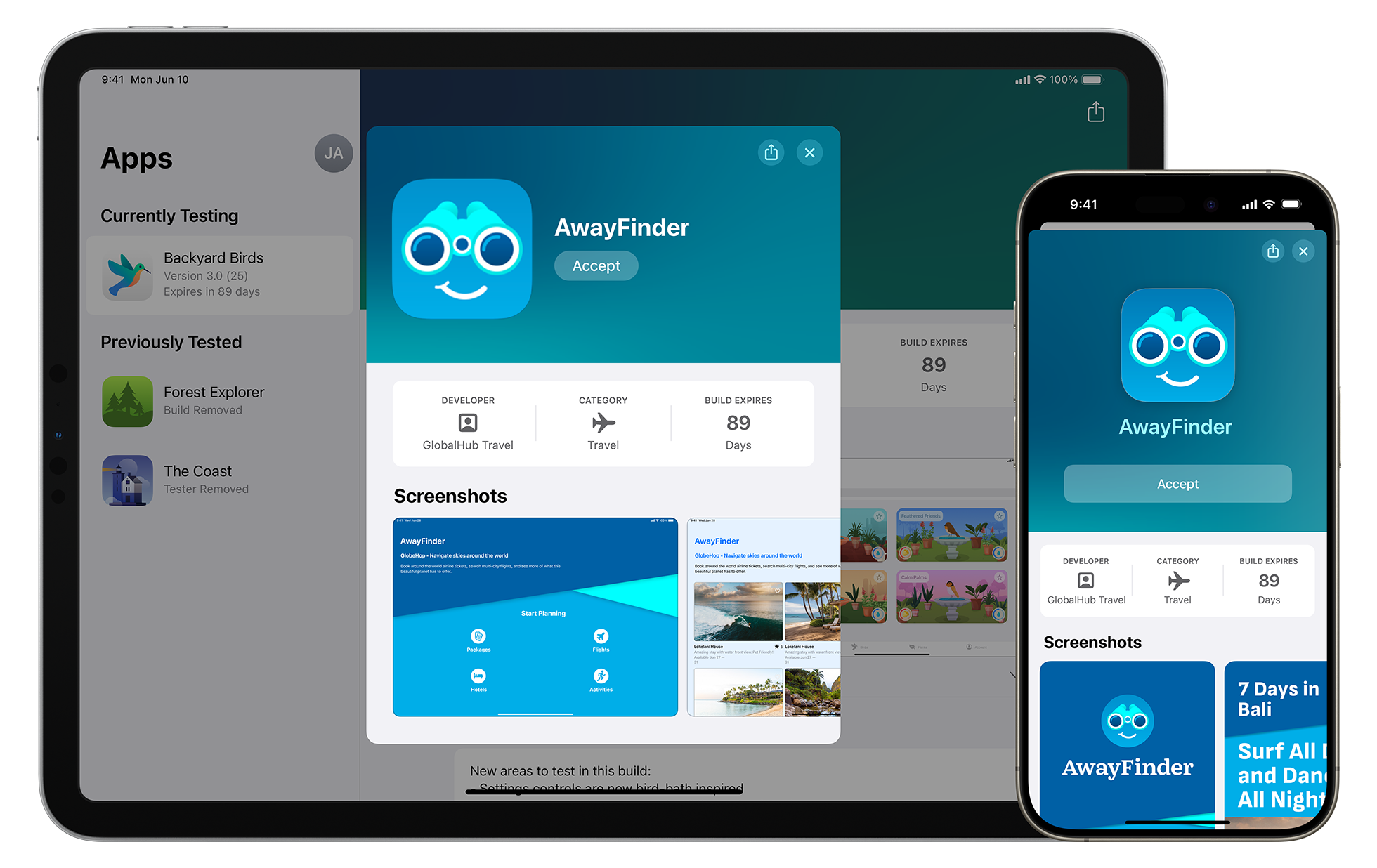 TestFlight로 Apple 플랫폼 전반에서 앱, 게임, 앱 클립을 게시하기 전에 테스터들의 피드백을 손쉽게 수집해 보세요. 베타 버전의 공개 범위를 전체 또는 팀 내부로 설정할 수 있습니다. TestFlight를 시작하는 방법을 알아보세요.