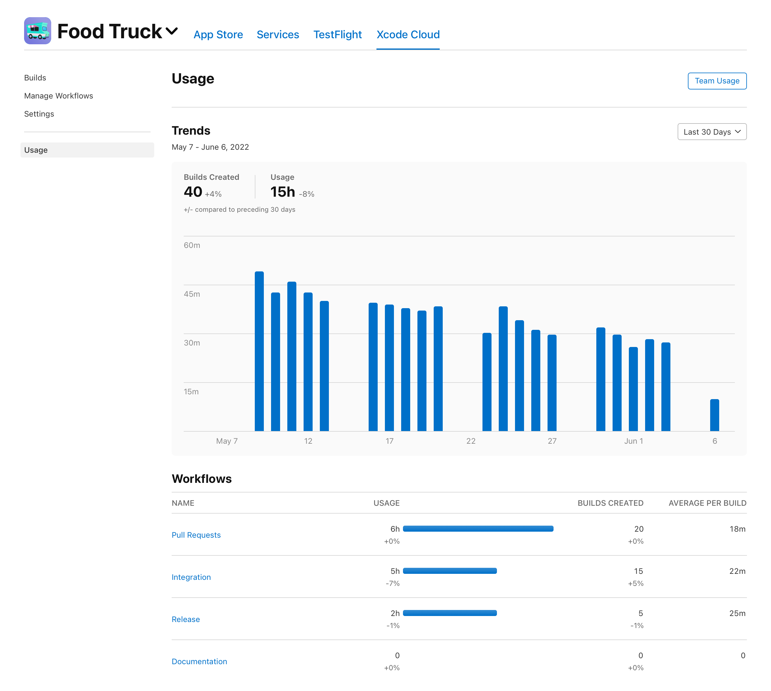 App Store Connect 및 Apple Developer 앱을 통해 팀의 컴퓨팅 시간 사용량을 추적할 수 있습니다. Xcode Cloud 사용량 데이터를 검토하는 방법에 대해 알아보세요.