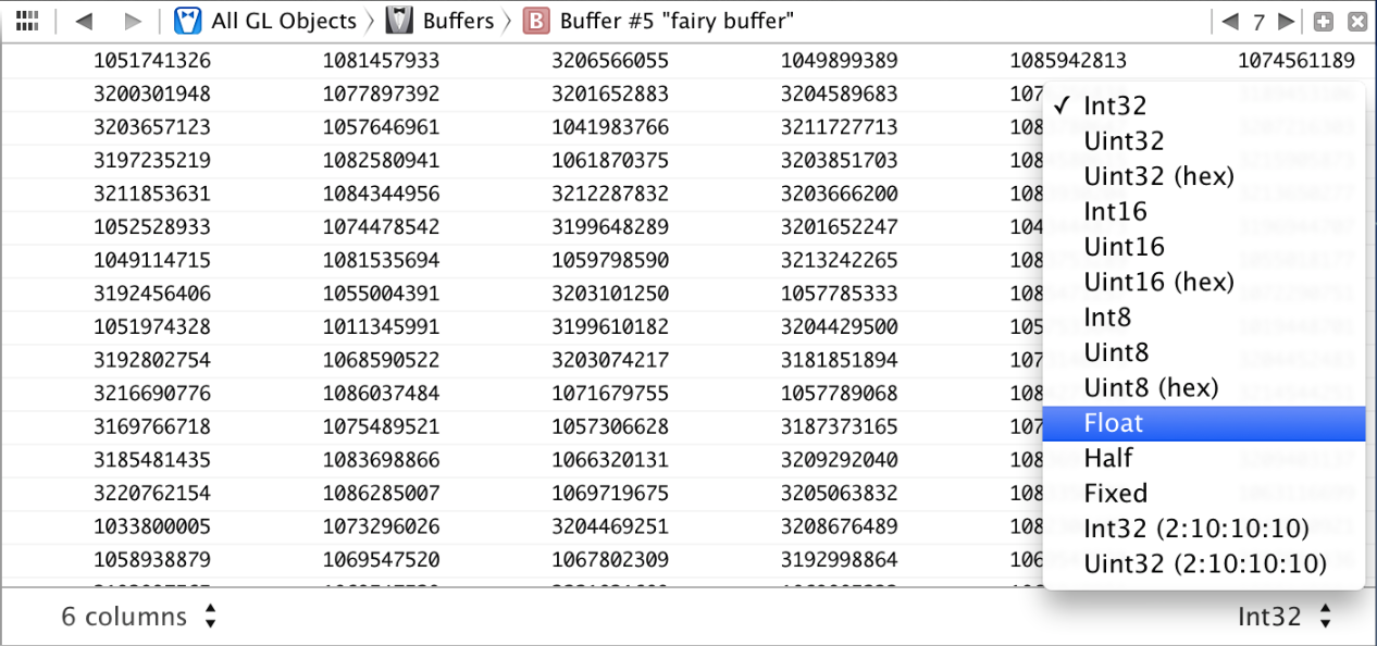 When you inspect an array buffer, the assistant editor shows the contents of the buffer (see Figure B-9). Because a buffer in OpenGL ES memory has no defined format, you use the pop-up menus at the bottom of the editor to choose how its contents appear (for example, as 32-bit integers or floating-point values, or as twice as many 16-bit integers or half-float values), and how many columns Xcode uses to display the data.