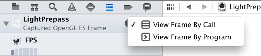 In the OpenGL ES frame debugger interface, the debug navigator is replaced by the OpenGL ES frame navigator. This navigator shows the OpenGL ES commands that render the captured frame, organized sequentially or according to their associated shader program. Use the Frame View Options popup menu at the top of the frame navigator to switch between view styles.