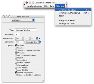 In some cases, you may want to create menu items that change depending on the state of the modifier keys held down by the user. For example, in the default Window menu, a menu item named “Minimize Window” changes to “Minimize All Windows” when the user depresses the Option key while the menu is open. Similarly, if the keyboard equivalent Command-M activates “Minimize Window,” Command-Option-M activates “Minimize All Windows.” Such items are called dynamic menu items.