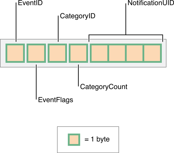 EventID: This field informs the accessory whether the given iOS notification was added, modified, or removed. The enumerated values for this field are defined in EventID Values.