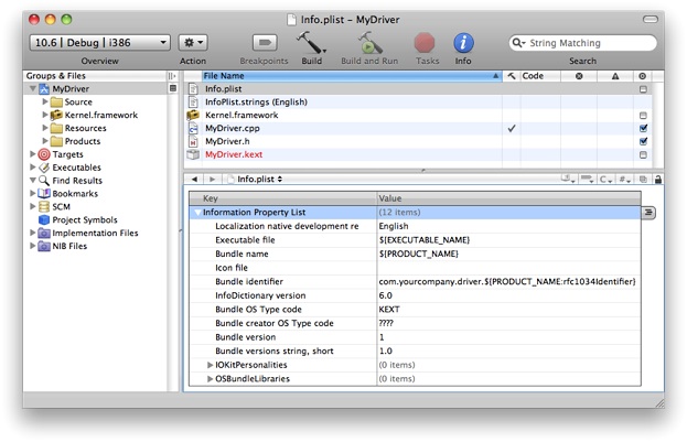 Info.plistfile in the editor pane. You should see the elements of the property list file, as shown in Figure 1.Figure 1 MyDriver Info.plist