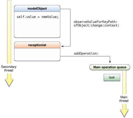 A KVO notification invokes the observeValueForKeyPath:ofObject:change:context: method implemented by an observer. If the change to the property occurs on a secondary thread, the observeValueForKeyPath:ofObject:change:context: code executes on that same thread. There the central object in this pattern, the receptionist, acts as a thread intermediary. As Figure 11-1 illustrates, a receptionist object is assigned as the observer of a model object’s property. The receptionist implements observeValueForKeyPath:ofObject:change:context: to redirect the notification received on a secondary thread to another execution context—the main operation queue, in this case. When the property changes, the receptionist receives a KVO notification. The receptionist immediately adds a block operation to the main operation queue; the block contains code—specified by the client—that updates the user interface appropriately.