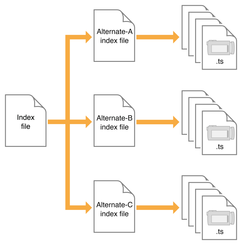 Both the master index file and the alternate index files are in .M3U8 playlist format. The master index file is downloaded only once, but for live broadcasts the alternate index files are reloaded periodically. The first alternate listed in the master index file is the first stream used—after that, the client chooses among the alternates by available bandwidth.