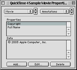 Movie and Web authors will find a number of enhancements, notably in AppleScript and QuickTime VR support, DV video compressor enhancements, new HTML embed tags, SMIL enhancements, and improved performance and quality of synthesis for the QuickTime Music Synthesizer. The editing and authoring interface for QuickTime Pro has been improved, adding menus and key commands for formerly “hidden” features. In addition, authors now have the ability to create movies using new media types, such as Flash 4, or MPEG-1 for Windows.