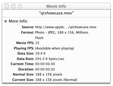There is a new Show Movie Info item in the Windows menu. This opens a single window containing summary information about the frontmost movie. The information displayed includes some subset of the following:
