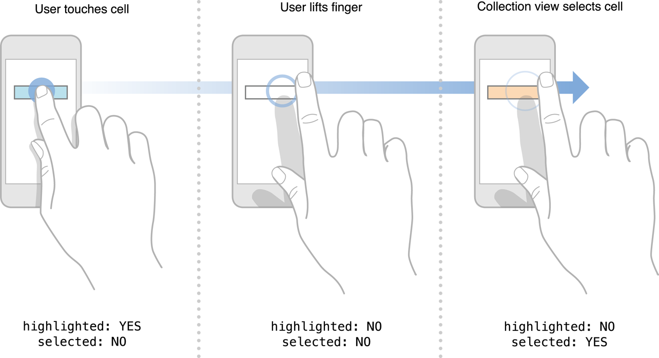 There is a subtle but important distinction between a cell’s highlighted state and its selected state. The highlighted state is a transitional state that you can use to apply visible highlights to the cell while the user’s finger is still touching the device. This state is set to YES only while the collection view is tracking touch events over the cell. When touch events stop, the highlighted state returns to the value NO. By contrast, the selected state changes only after a series of touch events has ended—specifically, when those touch events indicated that the user tried to select the cell.