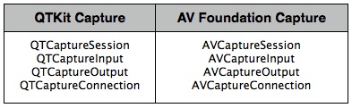 AV Foundation also provides a full suite of capture APIs that give you full access to the camera and provide for flexible output. The classes that make up the AV Foundation capture APIs closely resemble those in QTKit.