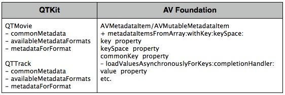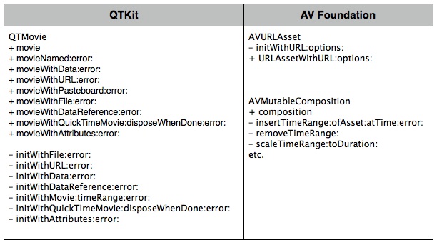 Here's a summary of the classes for representing audiovisual media with QTKit and AV Foundation: