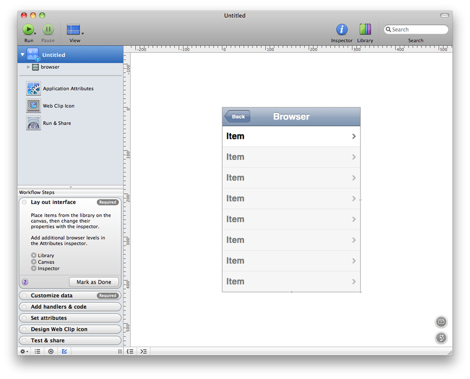 The Browser template gives you a mobile Safari web application that displays some built-in information and supports navigating from one page to the next. You don’t need to customize the application at all to see how it works, but you should specify a title to display.