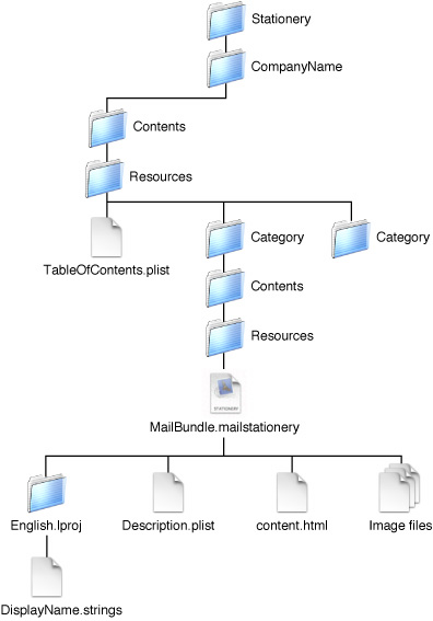 A stationery template is a bundle folder with the file extension .mailstationery. Inside the root folder is a Contents folder, and inside that is a Resources folder. All the files in the stationery bundle are located in the Resources folder.