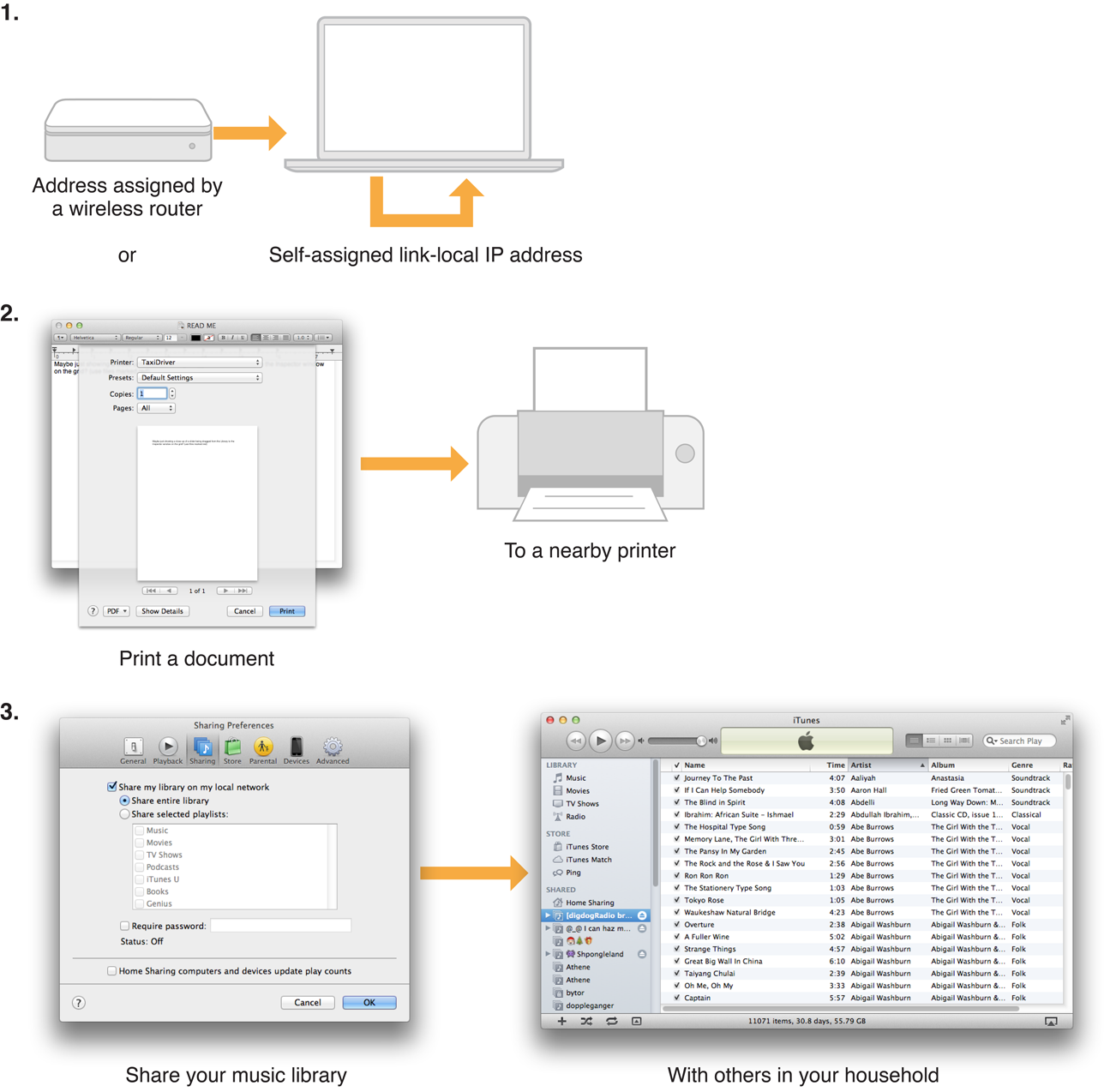 This scenario is illustrated in Figure 1-1. In step 1, you open up your laptop in your neighbor’s house, and the laptop either obtains an address from the DHCP server in the router or, in the absence of a DHCP server, assigns itself an available local address. In step 2, the network is queried for available printers so that when you open the Print dialog, your neighbor’s printer is listed. Finally, in step 3, you turn on music sharing on your computer, and your neighbor’s computer sees it and connects.