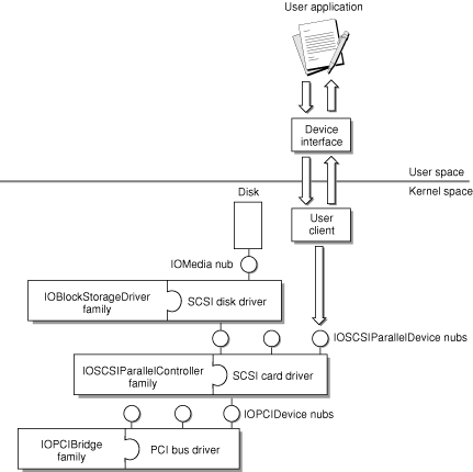 Figure 12-1 illustrates the I/O Kit architecture, using several example drivers and their corresponding nubs. Note that many different driver combinations are possible; this diagram shows only one possibility.