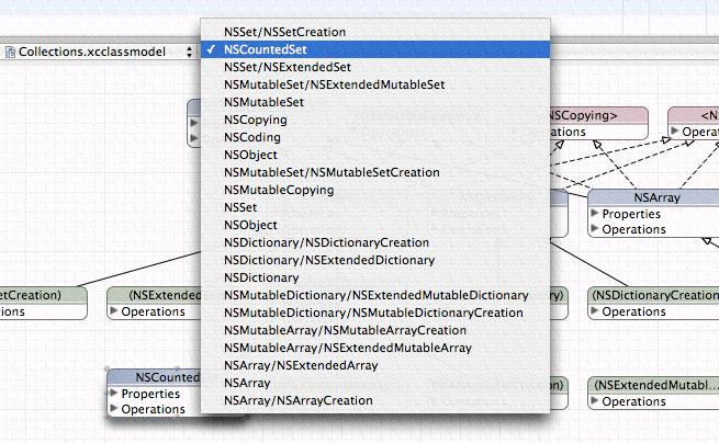 • Rolled up, so that just the name of the class or entity is showing. This gives the most compact representation, with maximum information density in the diagram. (In Figure 10-3 the NSDocument node is rolled up.)
