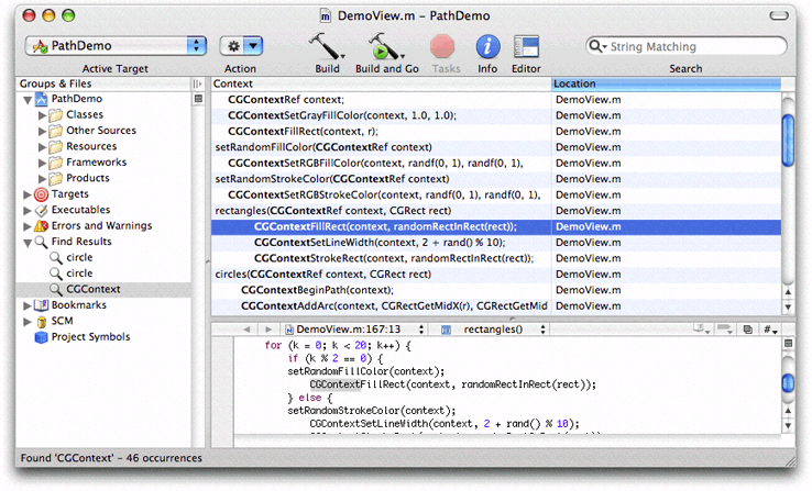 Xcode also maintains a great deal of information about your project’s contents, which it uses to assist you in the development process. The Xcode feature called Code Sense maintains an index that contains symbolic information for your project; Xcode uses this information as the basis for a number of features that let you browse the symbols in your project, view the class hierarchy of projects that use an object-oriented programming language, and search your project for symbol definitions.