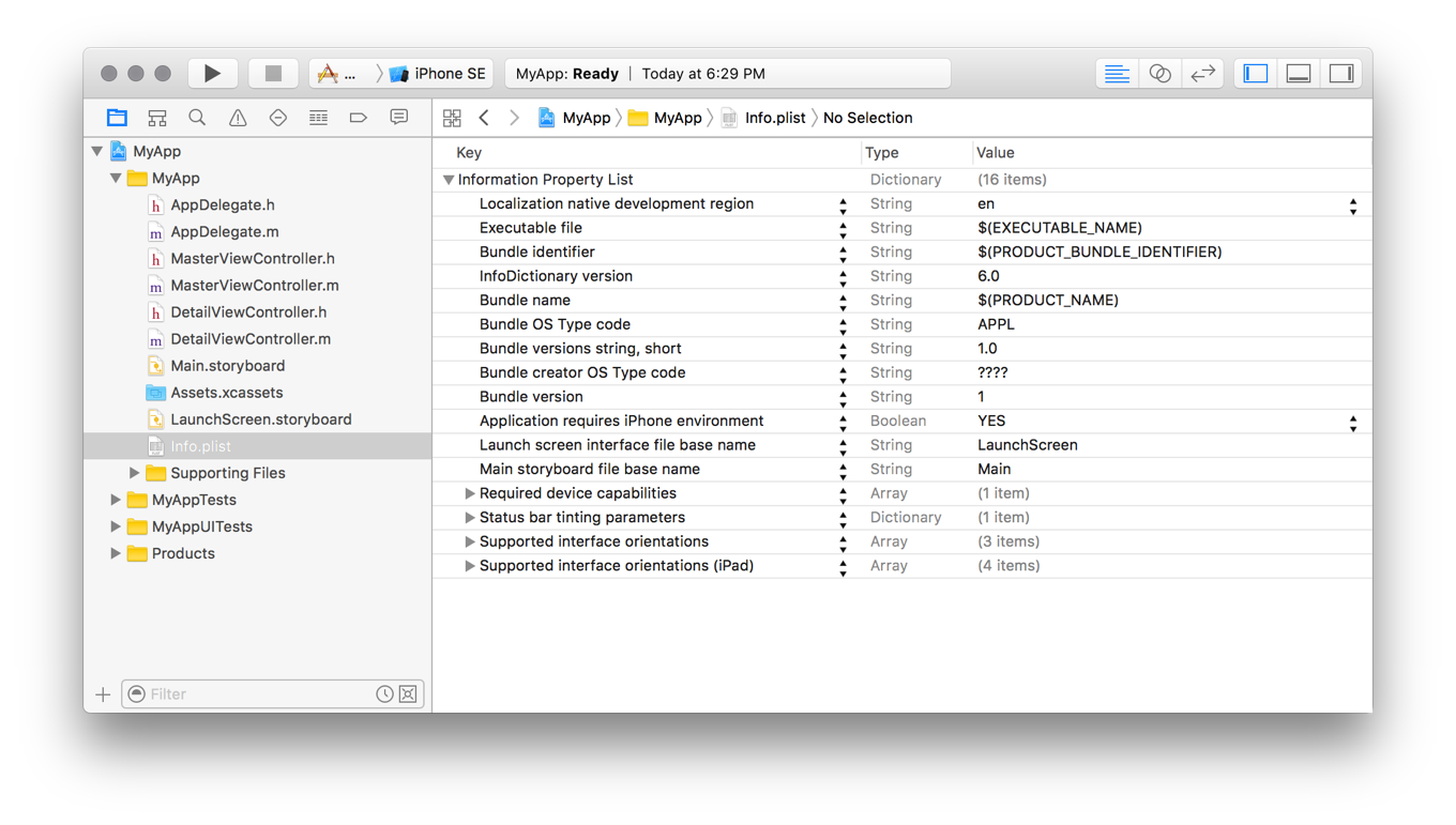 It is recommended that an iOS app include the following keys in its information property list file. Most are set by Xcode automatically when you create your project.