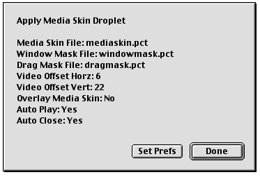 • The capability to customize the appearance of QuickTime Player by adding a “media skin” to your movie. A media skin specifies the size and shape of the window that the movie is displayed in, while also specifying which part of the window is draggable. A QuickTime movie does not have to be surrounded by a frame. No controls are displayed, except those embedded in the movie using Flash tracks or wired sprites.
