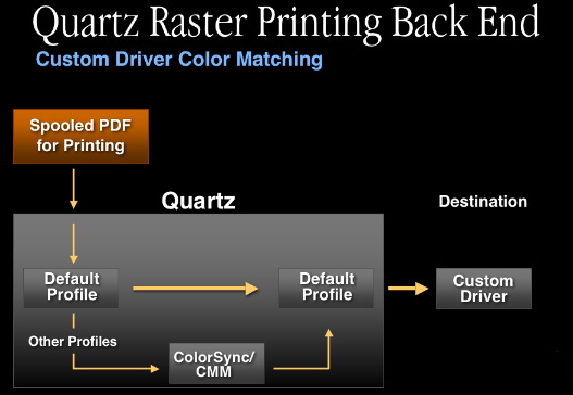 In terms of color processing, the application can request Quartz to render data in any of the PDF color spaces. To accomplish that, Quartz will convert all these into ICC profiles. Default profiles are selected by Quartz, but can be overridden by the application. Quartz will do all compositing in the working space, and ColorSync will be invoked to perform color transformations from any of the source color spaces to the working space. Finally, when compositing is completed, the rasterized data will be sent to the desired destination. Naturally, if the color space of the destination doesn't match the working space, and additional conversion must be done.